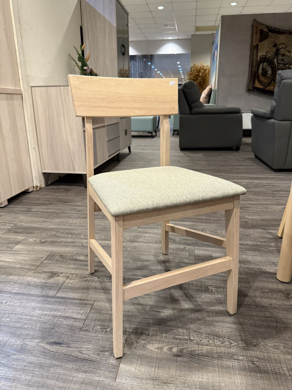 簡約木質結構,搭配灰色皮墊座面,兼具舒適與質感。耐用好搭配,適合各種餐桌風格。